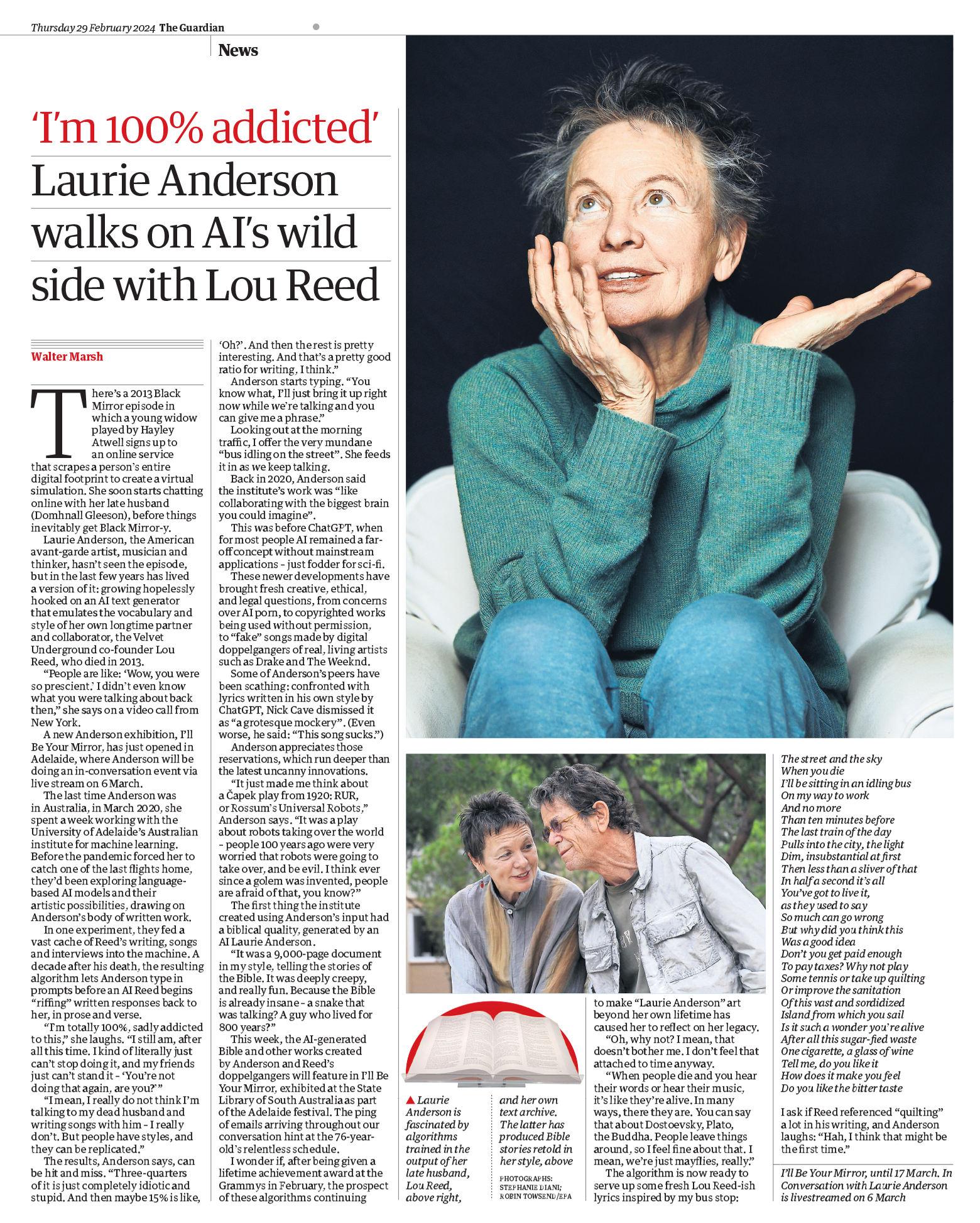 Laurie Anderson on making an AI chatbot of Lou Reed: ‘I’m totally, 100%, sadly addicted’ for The Guardian